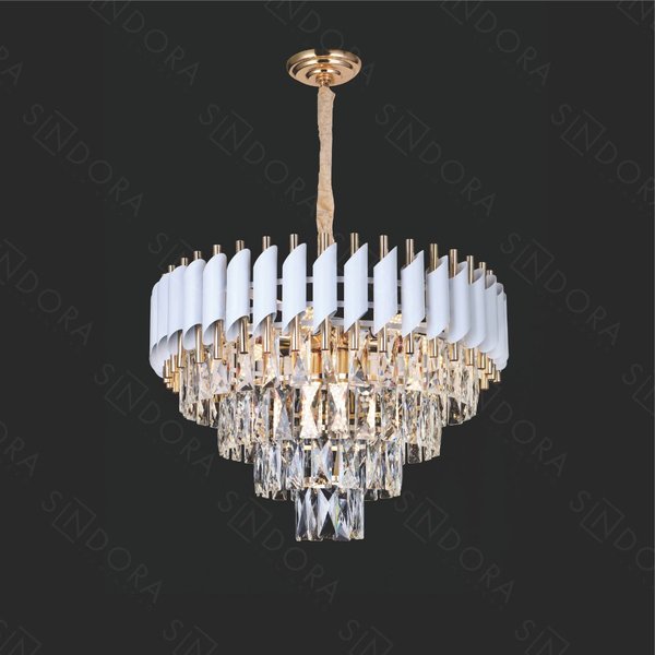 Pendente sofisticado com estrutura em metal branco e detalhes em cristal transparente, ideal para ambientes elegantes e requintados. Seu design clássico proporciona uma iluminação equilibrada e refinada.